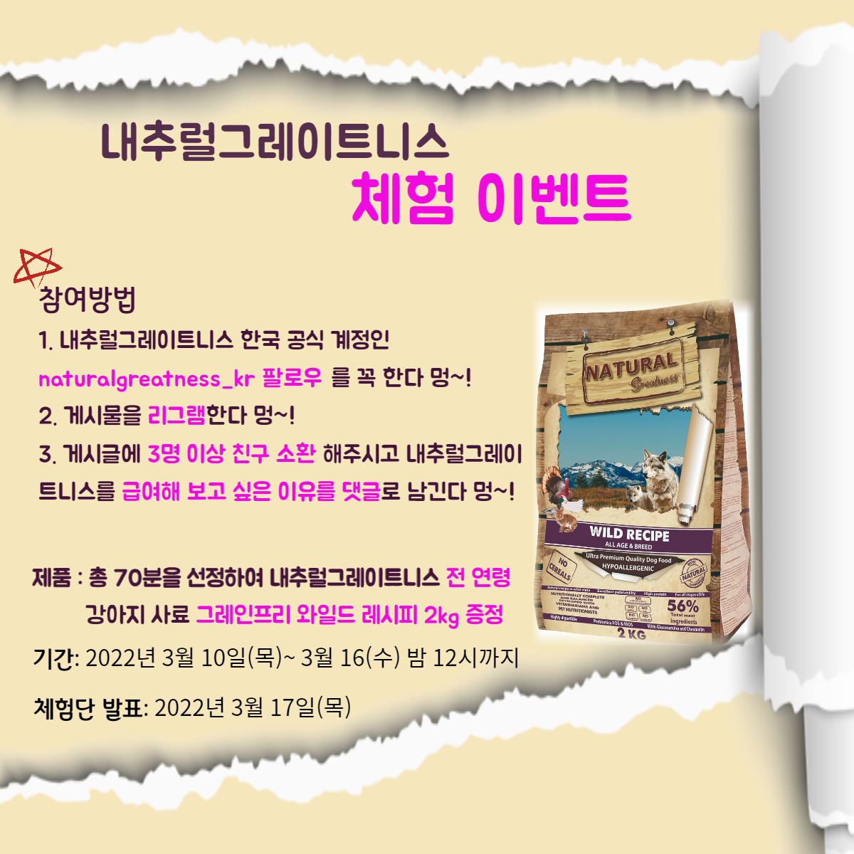 📣 Á¦ 2ȸ ¡°¸Ûµ¥ÀÌ¡±´Á´ë°¡ Á¶»óÀΠ챏µé¾Æ~ ´Ù ¸ð¿©¶ó~¸Û~!🐶🐕🐩🔔³»Ãß·²±×·¹ÀÌÆ®´Ï½º µ¶ ±×·¹ÀÎÇÁ¸® Àü¿¬·É »ç·á ¡°¿ÍÀÏµå ·¹½ÃÇÇ¡± ÃÑ 70ºÐ üÇè´Ü ¸ðÁý ¼±Á¤~💕3¿ù±îÁö ´ë¹Ú À̺¥Æ® ÁøÇà °áÁ¤~💝 💕¸¶Áö¸· ³»Ãß·²±×·¹ÀÌÆ®´Ï½º ÅëÅ« À̺¥Æ®°¡ µÉ °Í °°½À´Ï´Ù~💕🥰⏩️ ¡°¿ÍÀÏµå ·¹½ÃÇÇ¡± ⏪️💟 µ¿¹°¼º ¿ø·á ÇÔÀ¯·®: 56%💟µðÇÏÀ̵巹ÀÌÆ¼µå ¿ø·á(Å»¼ö °ÇÁ¶µÈ ¿À¸®, Ä¥¸éÁ¶, ´ß°í±â) + ½Å¼±ÇÑ Åä³¢°í±â »ç¿ë💟 Á¶´Ü¹é 33%ÀÌ»ó, Á¶Áö¹æ 19%ÀÌ»ó.¿·®: 4,050 Kcal/kg💟 ¾Ë°»ÀÌ Å©±â: Á÷°æ ¾à 12.5mm, µÎ²² ¾à7.5mm (Àü¿¬·É Áß´ëÇü°ß Ãßõ)´Á´ëÀÇ ÈļÕÀÎ °³°¡ ¾ß»ý »óÅ¿¡¼ »ç³ÉÇÒ ¼ö ÀÖ´Â ¸Å¿ì ³ôÀº ÇÔ·®ÀÇ °í±â ¼ººÐÀ» »ç¿ëÇÏ¿© »ý¾ÖÀÇ ¸ðµç ´Ü°è¿¡¼ ¸ðµç °ßÁ¾ÀÇ °¾ÆÁö¸¦ À§ÇÑ ¿µ¾ç ¿ä±¸¸¦ ÃæÁ·½Ã۱â À§ÇØ °î¹°À» »ç¿ëÇÏÁö ¾ÊÀº ¿ì¼öÇÑ ÀúÀڱؼº ·¹½ÃÇÇÀÔ´Ï´Ù~💕💕💕ÈÞ¸Õ ±×·¹À̵å A±Þ ÃÖ»óǰ À°·ù¸¦ ¼±º°, »ç¿ëÇÑ ³ôÀº ºñÀ²ÀÇ À°·ù´Â ¿ì¸® °¾ÆÁö¸¦ ´õ Ȱ·ÂÀÖ°Ô ÇÏ¸ç ±ÙÀ°·®À» ³ôÀ̰í À¯ÁöÇÏ´Â µ¥ µµ¿òÀ» ÁÝ´Ï´Ù~💚💙💜¡°¿ÍÀÏµå ·¹½ÃÇÇ¡±´Â ¼ºÀå±â ¾î¸° °¾ÆÁöºÎÅÍ È°µ¿ÀûÀÌ¸ç ±ÙÀ°·®ÀÌ ÇÊ¿äÇÑ ¼º°ß ¶Ç´Â ÀÓ½ÅÇÑ °¾ÆÁö¸¦ À§ÇÑ ·¹½ÃÇÇÀÔ´Ï´Ù~❤️🔥💞❤️🔥👉 ÇÁ¸®¹ÙÀÌ¿Àƽ½º, ±Û·çÄÚ»ç¹Î°ú Äܵå·ÎÀÌÄ£, õ¿¬ Ç×»êÈÁ¦ ÇÔÀ¯.👉 ¾Ë·¯Áö ÃÖ¼ÒÈ(ÇÏÀÌÆ÷ ¾Ë·¯Áö), ÈÞ¸Õ ±×·¹ÀÌµå °í±â »ç¿ë, ÃÖ°í±Þ Ä÷¸®Æ¼ ¿ïÆ®¶ó ÇÁ¸®¹Ì¾ö »ç·á~💖 ±âÈ£¼º ÃÖ°í~💕💕💕👉 NO Àΰø°¨¹Ì·á, NO Àΰø»ö¼Ò, NO ¹æºÎÁ¦, NO À¯´ç, NO Äá, NO À¯ÀüÀÚ º¯Çü, NO µ¿¹°½ÇÇè~❣️¢º️ Áö¿øÀÚ°Ý1. Áö¿ø ¹æ¹ý 3°¡Áö ¹Ì¼ÇÀ» ¿Ï·á ÇϽŠºÐ.2. Á¦ 1ȸ ¡°·¹ºø ·¹½ÃÇÇ¡± ¿ì¼ö ¸®ºä ´ç÷ÀÚ ºÐµé(5¸í)Àº Á¦¿Ü. ´õ ¸¹Àº »õ·Î¿î ºÐµéÀÌ Ã¼Çè ÇÒ ¼ö ÀÖµµ·Ï ¾çº¸ ºÎʵ右´Ï´Ù~3. Á¦ 1ȸ ¡°·¹ºø ·¹½ÃÇÇ¡± üÇè´Ü ºÐµé Áß¿¡ ±Þ¿© ÈÄ±â ¾È ¿Ã¸®½Å ºÐµé Á¦¿Ü. °³ÀÎ »çÁ¤»ó ´Ê °Ô¶óµµ ¿Ã·Á ÁֽŠºÐµéÀº Âü¿© °¡´ÉÇϼ¼¿ä~¢º️ Áö¿ø¹æ¹ý1. º» °èÁ¤ @naturalgreatness_kr ÆÈ·Î¿ì¸¦ ²À ÇÑ´Ù~¸Û~❣️2. °Ô½Ã¹°À» ¸®±×·¥ ÇÑ´Ù~¸Û~❣️3. °Ô½Ã±Û¿¡ Ä£±¸ 3¸íÀÌ»óÀ» ¼ÒÈ¯ÇØÁֽðí, ¡°¿ÍÀÏµå ·¹½ÃÇÇ¡±¸¦ ±Þ¿©ÇØ º¸°í ½ÍÀº ÀÌÀ¯¸¦ ´ñ±Û·Î ³²±ä´Ù~¸Û~❣️ (¼±Á¤ ±âÁØ¿¡ Áß¿ä~❗️)⚜️ üÇè Á¦Ç°: ³»Ãß·²±×·¹ÀÌÆ®´Ï½º °¾ÆÁö »ç·á ±×·¹ÀÎÇÁ¸® ¡°¿ÍÀÏµå ·¹½ÃÇÇ¡± 2kg🔷️ ¸ðÁýÀοø: ÃÑ 70ºÐ ¼±Á¤🔷️ Áö¿ø±â°£: 2022³â 3¿ù 10ÀÏ(¸ñ)~ 16ÀÏ(¼ö) ¹ã 12½Ã±îÁö.🔷️ Ãß÷ÀÏ: 3¿ù 17ÀÏ(¸ñ)Àüü °ø°³ °èÁ¤¸¸ ¼±Á¤ °¡´É~❗️❇️ º¸³Ê½ºÃ¼Çè´Ü 70ºÐ ±Þ¿© Èıâ Áß ÃÑ 5ºÐÀ» ¼±Á¤ÇÏ¿© 12kg- 2¸í, 2kg 2°³-3¸íÀ» ¼±Á¤ÇÏ¿©ÁõÁ¤ÇÕ´Ï´Ù. (º°µµ DM¹ß¼Û)À̹ø À̺¥Æ®¿¡ ´õ ±Ã±ÝÇϽŠ»çÇ×Àº DMÀ¸·Î ¿¬¶ô ÁÖ½Ã¸é ¼º½ÇÈ÷ ´äº¯ µå¸®°Ú½À´Ï´Ù~💕À̹ø ¸¶Áö¸·ÀÌ µÉ ³»Ãß·²±×·¹ÀÌÆ®´Ï½º ´ë¹Ú ÅëÅ« À̺¥Æ®¿¡ ¸¹Àº °ü½É°ú Âü¿© ºÎʵ右´Ï´Ù~🙏🙏🙏❤❤❤🏠 www.pnvipet.com#³»Ãß·²±×·¹ÀÌÆ®´Ï½º #¿ÍÀϵ巹½ÃÇÇ #±âÈ£¼ºÁÁÀº»ç·áÃßõ #Áß´ëÇü°ß»ç·áÃßõ #Àü¿¬·É°¾ÆÁöÃßõ»ç·á